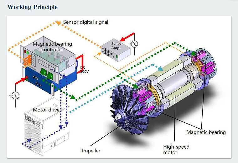 - The active magnetic bearing system is adopted without abrasion and in no need of lubrication of maintenance.
