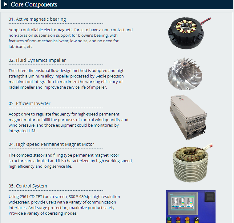 - The magnetic bearing is completely free of friction such that the possibility of product damage can be reduced and the service life of blower can exceed 20 years.